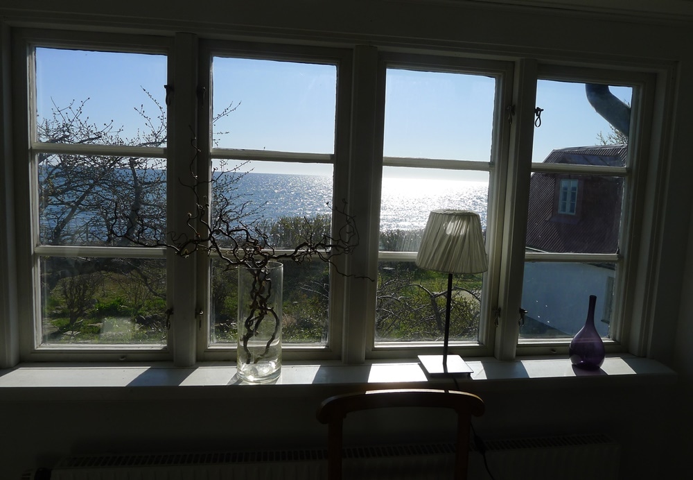 We offer a modern loft-like summer stay overviewing the sea within walking distance from the beach. The house consists of three rooms, one master bedroom with windows from floor to roof towards the fields, an additional bedroom with two single beds, and a living area with kitchen and lounge, also with windows covering the wall towards the garden. Outside there is a lawn, with barbecue and furniture for outdoor living, plus an outdoor shower.
