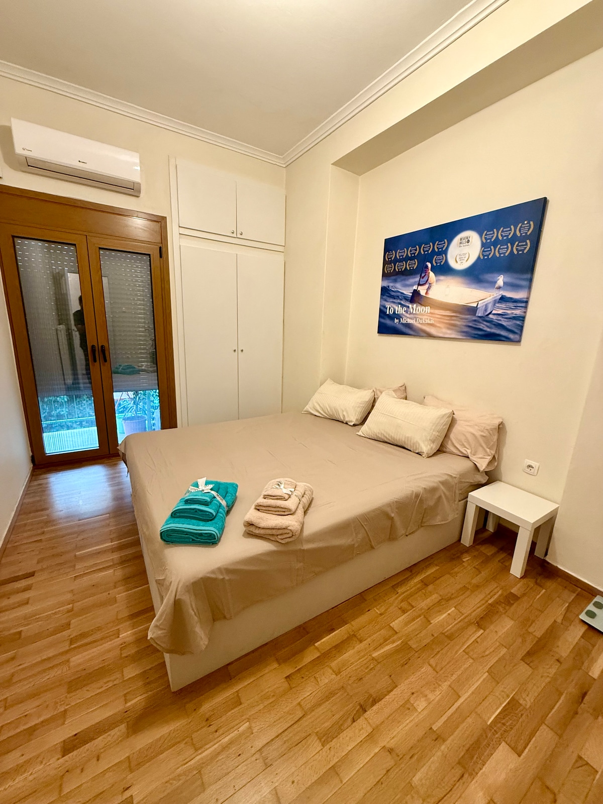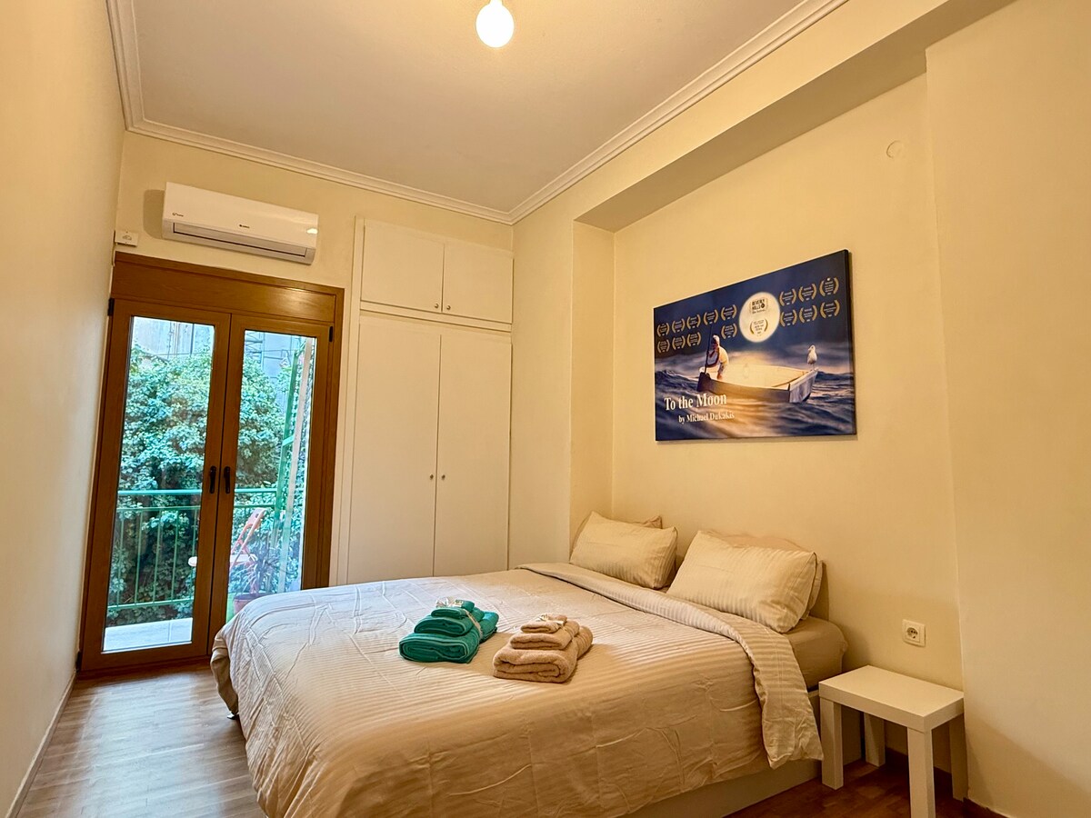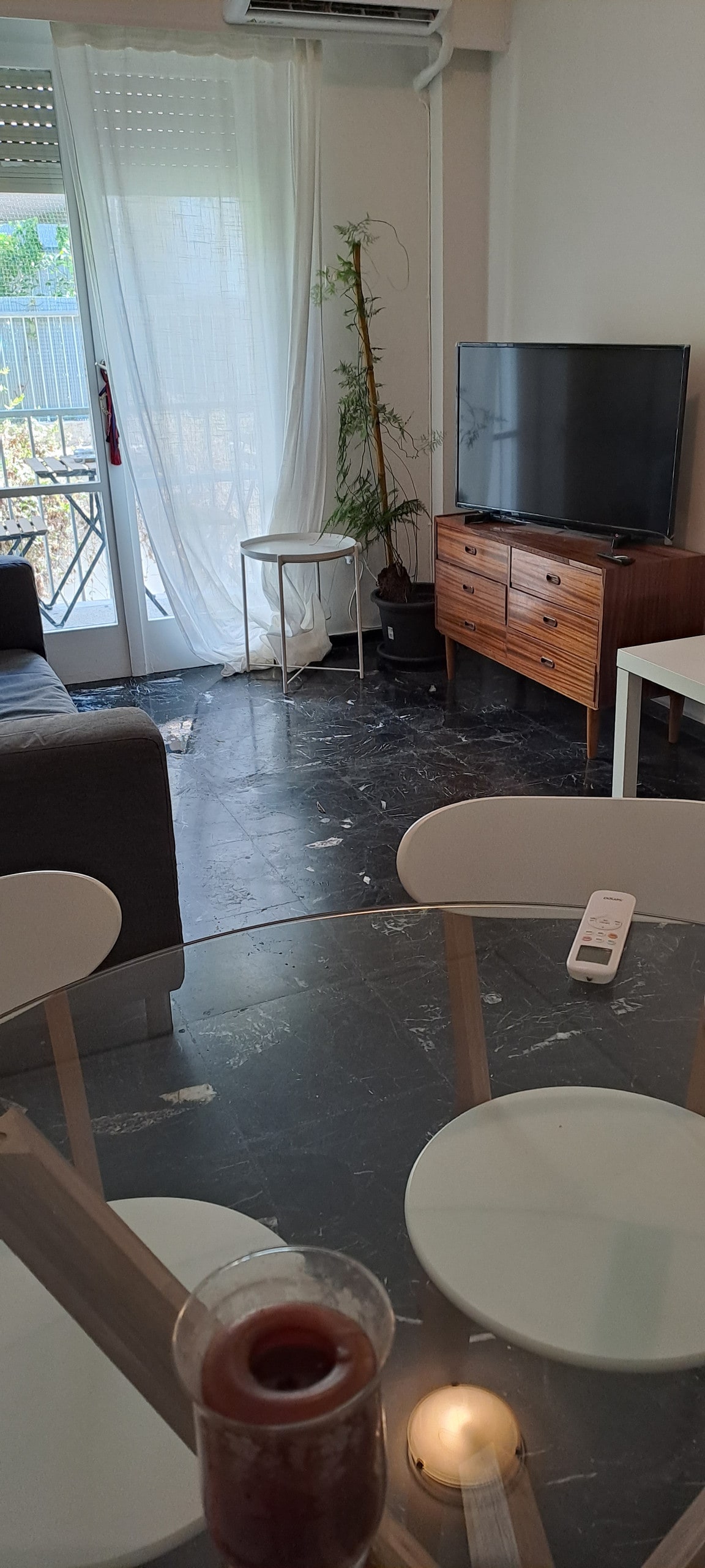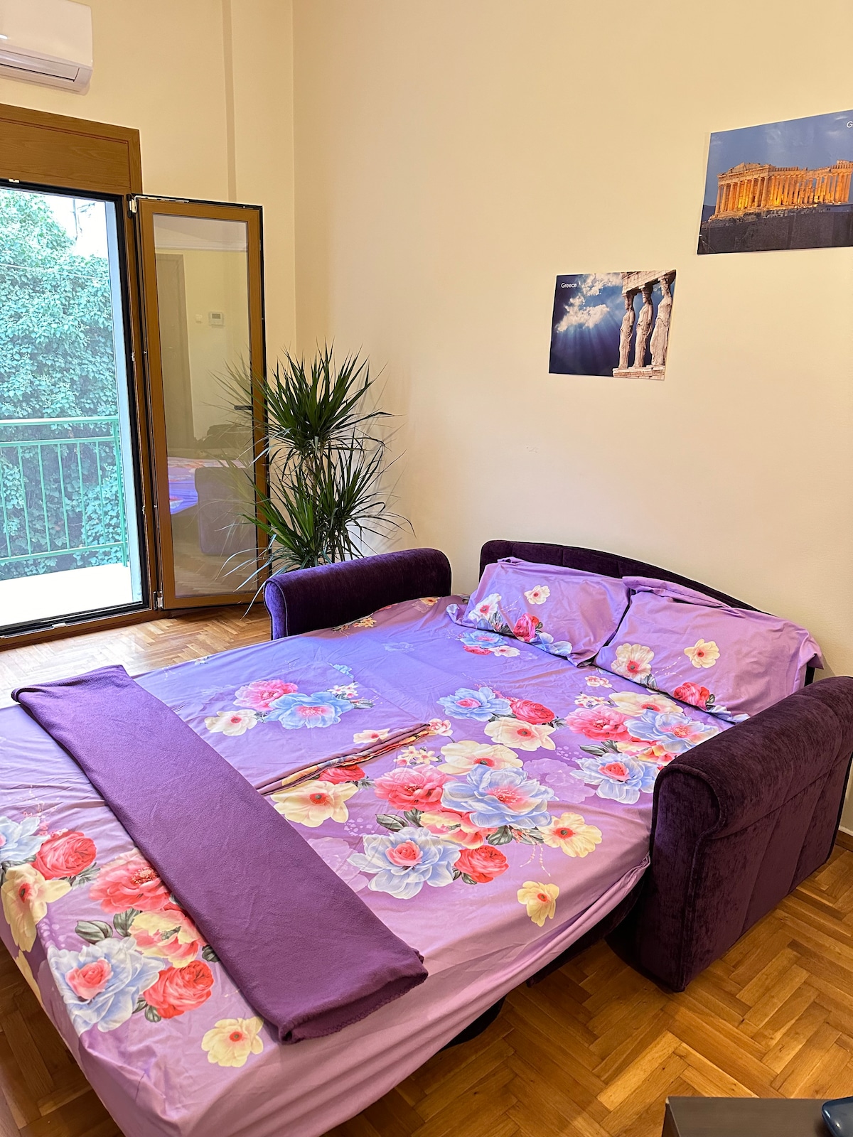 50 square meters apartment, located in a safe & quiet family area of Athens (includes a small balcony with view into a charming courtyard with trees). The apartment features a kitchen, new fridge, new safety doors, windows, & patio doors. The shutters are operated electronically with remote controls. There's new heating & cooling A/C system, unlimited wifi connection, & a new TV for your enjoyment. There is one huge bed in the bedroom & 1 sofa that becomes a double bed in the living room.