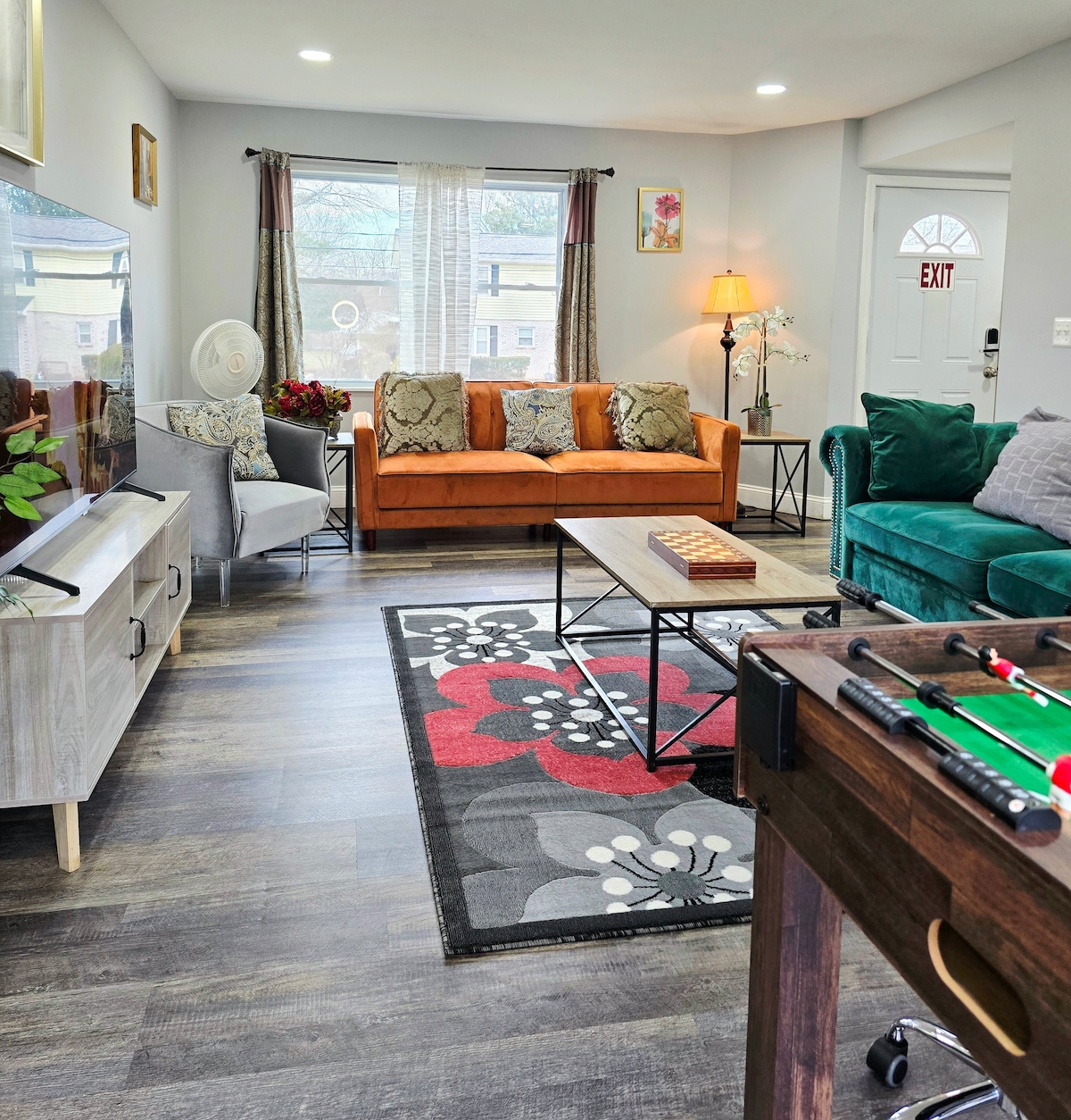 Fun, stylish, and built for all age groups!! Hot tub for the adults and climbing tower and games for the kiddos. Mid century modern theme throughout the home to provide a unique and cool experience. Tons of games and lots of space to play them. Huge livingroom to gather and a great family room with a beautiful city light view in the winter. Only 5 mins from DC and walking distance from Cheverly Metro. Inside the beautiful and quaint town of Cheverly MD. NO Parties!! Basement not included.
