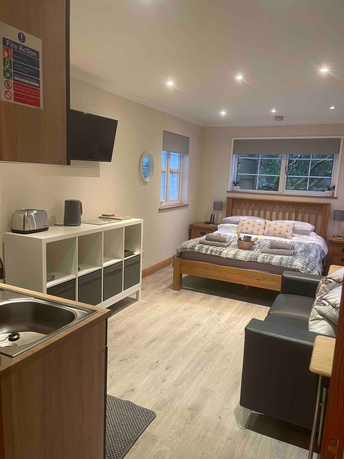 Wrens nest is a cozy one-room cottage with an open plan design that combines charm with functionality. The main room features a simple layout where the bed, sofa and kitchen area share the same space. The comfortable oak framed bed has neutral linens and bedside tables with reading lamps. The two seater sofa has small foldable tables for dining. The kitchen occupies one wall with simple cabinets, two burner hob, fridge, microwave and small air fryer. The shower room has wc & sink with storage.