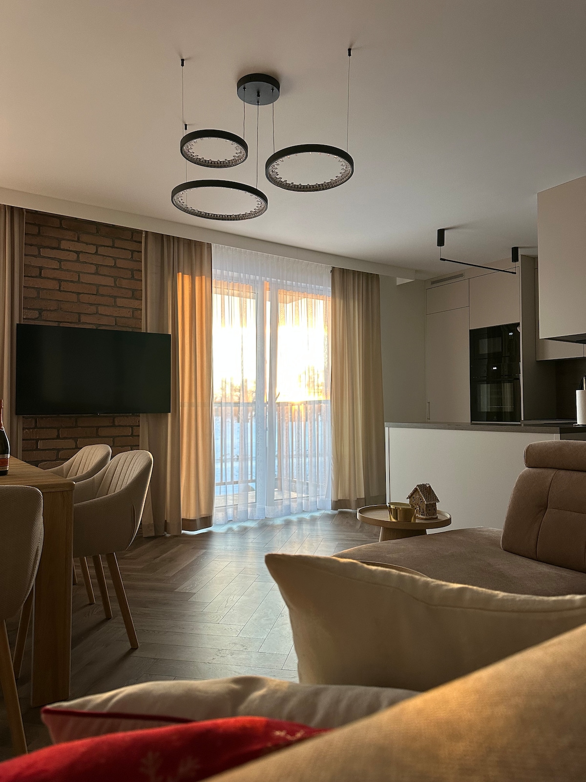 The apartment is located on the beautiful Lake Czorsztyn at the foot of the Pieniny Mountains. In summer, active people will appreciate almost 40 km, the most beautiful bicycle route in Poland running around the lake, beaches or the possibility of renting water equipment. In winter, on the other hand, there are many ski resorts and as many as 4 different mountain ranges. The facility, which was commissioned in 2021, has a well-equipped gym, sauna, bike room, ski room and laundry room.