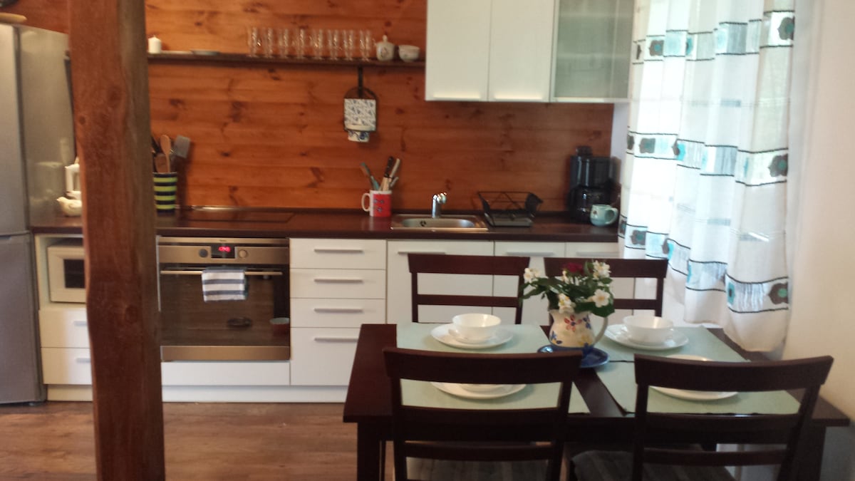 A two-story house with a terrace, garden, and stunning views of nature. 4 bedrooms, 3 bathrooms, 2 kitchens, and a spacious living room with a fireplace. All fresh and functionally furnished. The garden features a lawn, forest, a fireplace, a grill, loungers, hammocks, and a swing. The perfect place for a family or friends to escape the hustle and bustle of the city. No neighbors on the immediate border. Forests, lakes, bike trails, and kayaking trails are nearby. No large parties allowed.
