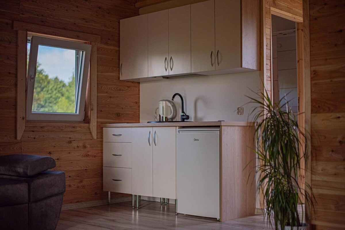 Our wooden cottage has been designed to be modern and functional. We tried to blend in perfectly with the surroundings and not to disturb the nature that surrounds us from all sides. Our small village has not succumbed to time, everything works here as before. There is no shop, no restaurant, no tourists, only silence and nature. The village is surrounded by meadows and the Puszcza Piska forest, 10 km to the nearest towns. Cranes and countless water birds invite you to a daily spectacle. Here you will find peace