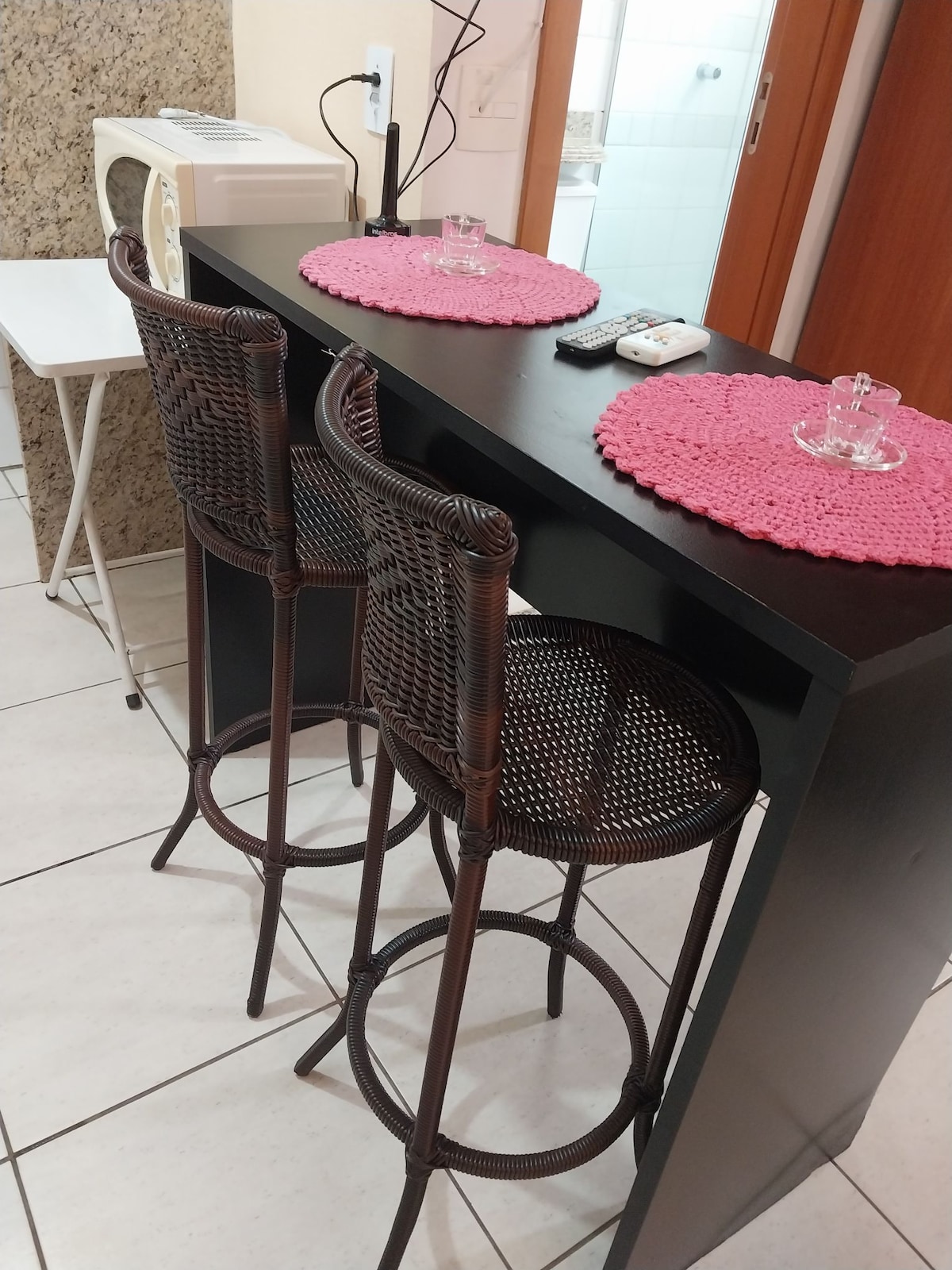 Apartment in a low building, no elevator Queen bed, cabinets, countertop with dining stools, 42”TV + Netflix and Prime Video, air conditioning, refrigerator, 4 burner cooktop, ice water filter, sandwich maker, coffee maker, blender, microwave, cooking pans and utensils, washing machine, hairdryer, bed/bath linen + iron. TV Automation, Air & Lights via Alexa Laptop table. Discreet access. 2 parking spaces inside the building.
