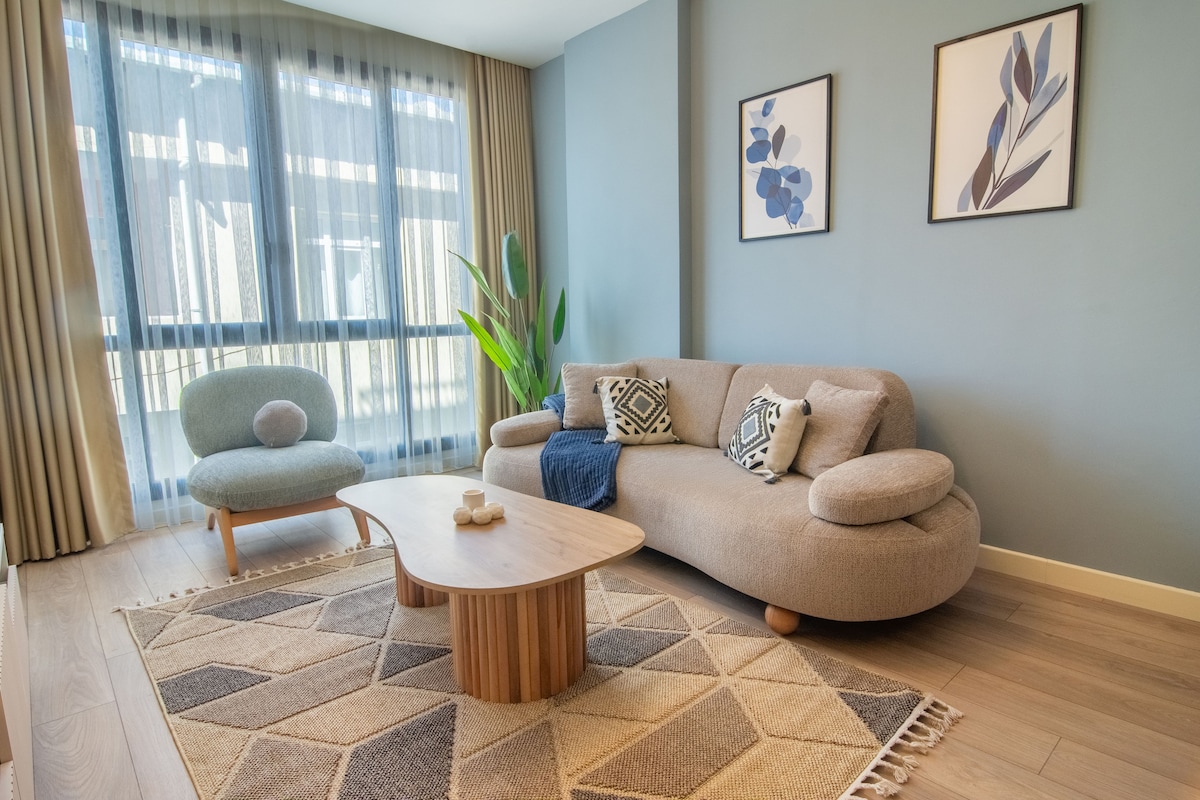 The apartment welcomes you with it's relaxing interior and spectacular Historical Peninsula view. This amazing sight becomes even more magical from the balcony every season and every hour of the day.All the furnitures are chosen from exclusive design brands and aiming to make you feel comfortable in a luxury zone. The turquoise tiles are handmade gives the personality to this magical living space. The walls has a beautiful harmony with again beautiful custom made floor tiles.