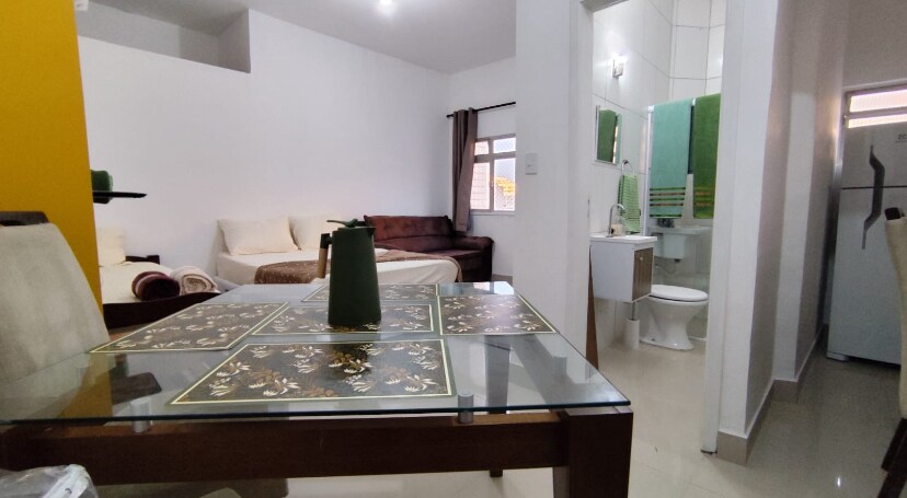 Abrace o descanso em um kitnet tranquilo e bem localizado. A 50 metros da Praia, próx ao Shopping, com os melhores bares, restaurantes e comércio da região! Excelente para Home Office , completo e compacto com : ✅fogão, geladeira, ventilador de teto e portátil , filtro, air fryer, microondas, forno, chuveiro, sanduicheira, cafeteira. ✅cama de casal , sofá-cama. ✅copos,talheres, toalhas, lençóis, travesseiros. ✅TV smart e wifi rápido, ideal também p/ Home Office. ✅Plataforma Streaming.