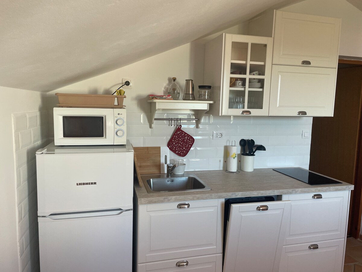 Relax in this beautiful and modern penthouse in unsoiled and quiet part of the island Krk in Croatia. This is the perfect place to charge your batteries and enjoy the nature of this beautiful island. The apartment is located 3 minutes from the nearest beach, in a hypnotizing beautiful nature with a stunning view. It can comfortably fit 4 people. Main bedroom has a double bed and a second one has a single bed that can become big for 2 people.