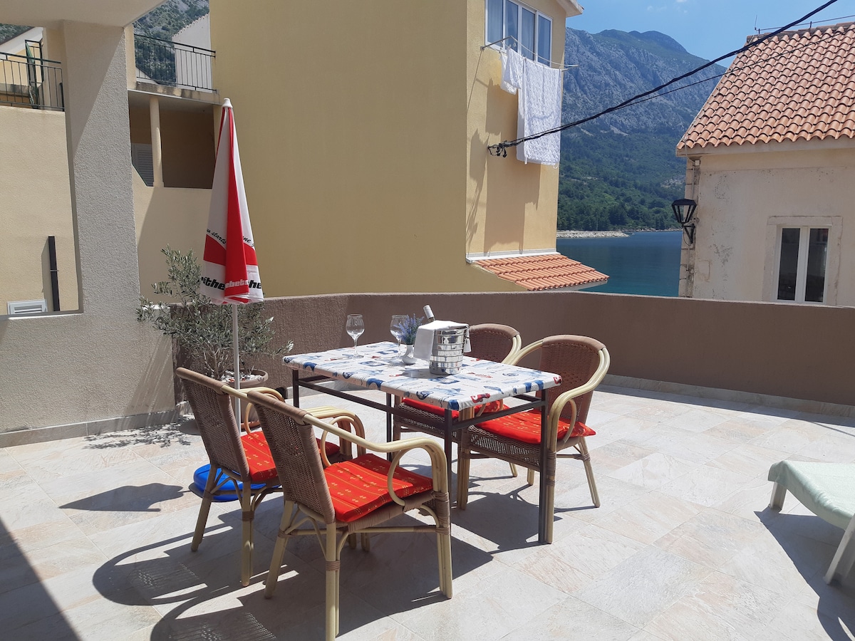 Comfortable & cosy apartment with beautiful seaview situated on the Igrane promenade, 2 meters from the beach. It has 50 m2 south-facing terrace with sun loungers-provides sun all day, but also a shade. It will put you in a holiday state of mind instantly! It's also equipped with AC,WiFi, kitchen utensils etc. You will find anything you need quickly near the apartment-supermarkets (20 m), caffes, souvenirs shops (5 m), ATM (2 m) etc. It's recommended for a great summer holidays to remember!