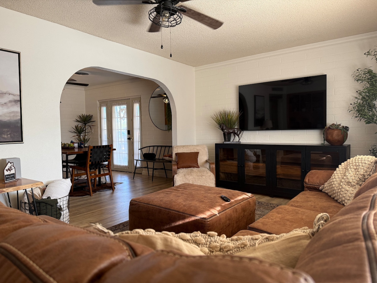 Charming, centrally located cottage in Safford! Enjoy a remodeled kitchen with granite countertops, an updated bathroom, and fresh flooring throughout. Relax with a 70" TV in the cozy living room or unwind in the spacious backyard with fruit trees, benches, and a grill. The cottage features a king-size bed, two full-size beds, an air mattress for extra sleeping space, and all-new bedroom furniture. With a small gym, ample parking, and a fenced yard for privacy, it’s a peaceful retreat in Safford