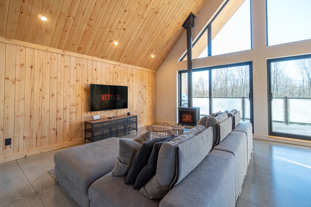 Monumental open concept, in the heart of nature. Access to trails directly behind the house. Wood stove, large modern bathroom, one bedroom + sofa bed. Another sofa bed in the living room. Ideal chalet for a couple with children or two couples. Wild birds, turkey, and deer lovers welcome! Wifi and EV charger included. Dogs Welcome! CITQ : #308038
