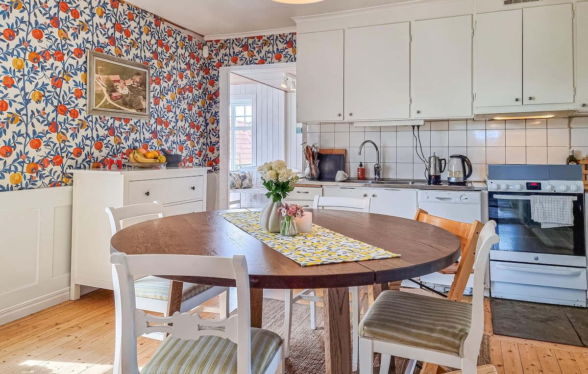 Snickaren har mycket släkthistoria och tillhör de äldsta husen i Grästorp. Vi har reparerat huset i gammal och ny stil. Det finns en fin ingång med underbart gamla originaltapeter och köksinredningen är historisk men nymålat. I de flesta rum har vi tagit fram de ursprungliga trägolven och målat spännvävstaken. Vi hyr ut en lägenhet där det ingår två sovrum (4 sängar), kök, allrum, dusch, wc. Vi kan sätta in två extrasängar för barn. Inga djur är tillåtna. Vi har en stor trädgård.
