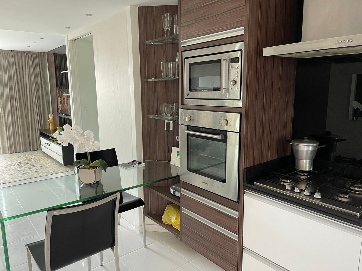 Complete flat at the Portal de Gravatá Hotel, with 2 bedrooms, one suite with a double bed and another with a bunk bed and a single bed with an extra bed. Cozy living room, equipped kitchen, split air in all rooms and 2 bathrooms. Enjoy the hotel's facilities: swimming pools, sauna, gym, courts, game room, restaurant, playground and 24-hour reception. Comfort of home with hotel services, close to downtown and the city's main attractions!
