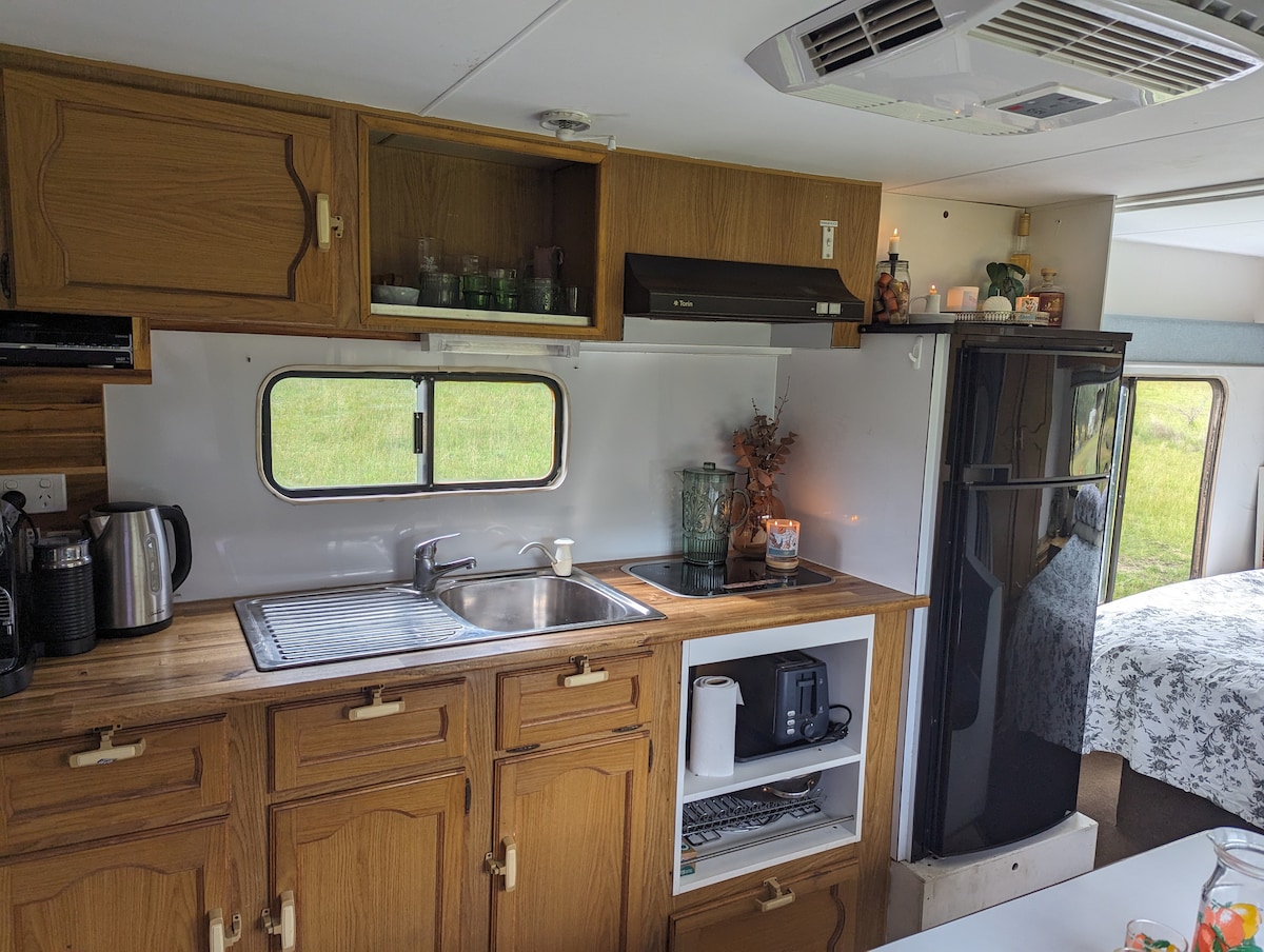 The Bedford Bus is one step up from camping! Nestled between the gum trees, and tucked away under a neat shelter with a rustic camp kitchen with plenty of charm. Step inside the Bus and discover an exciting, cosy and welcoming space! Creatively converted into bedroom/lounge. Private curtains, furnished and renovated. Outdoor rustic wooden coffee table and bench seat setting to enjoy a coffee with the morning sunrise! Self Catered Accommodation. Linen and bedding supplied on request.