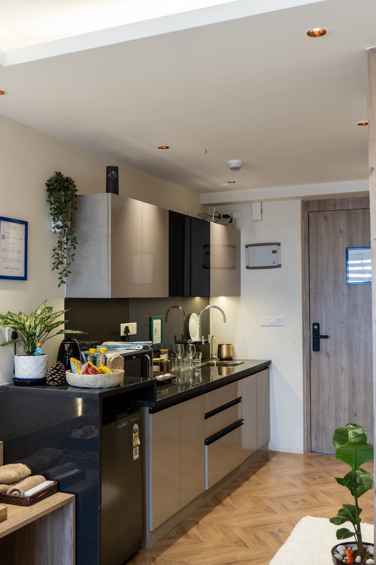 A modern and comfortable studio in Greater Noida, with direct Metro connectivity and a short drive to the India Expo Mart. Your stay includes thoughtful touches like a welcome basket, curated books, and essential toiletries. 🛏️ Enjoy a king bed, sofa bed, fast WiFi, Smart TV, work desk, and a full kitchen. 📍 Located in the same building as Burger King, Domino’s, California Burrito, and cafes. 🚆 Just a few steps from Delta 1 Metro Station. Fourwalls - A little stay made with love 💙