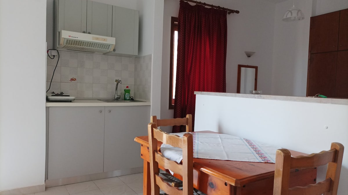 Apartment size: 45 m² Tip: This room is bigger than most in Karterados Beds: 1 double bed, 1 sofa bed. Apartment facilities: Balcony, Garden view, Terrace, TV, Safety Deposit Box, Air Conditioning, Desk, Seating Area, Sofa, Mosquito net, Wardrobe/Closet, Clothes rack, Bath, Toilet, Bathroom, Refrigerator ,Toaster, Barbecue, Coffee machine, Dining table, Towels/Sheets (extra fee), Towels, Upper floors accessible by stairs only.