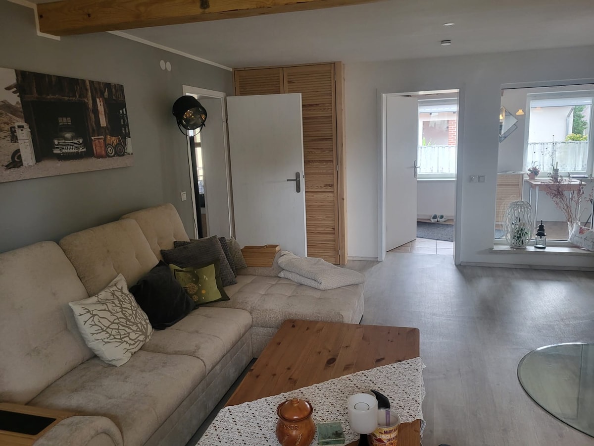 We offer you our granny apartment with separate entrance as a vacation home. The apartment is designed for 2 people and 1 max 2 children and has a room with a large box spring bed, folding couch (as an extra bed), a fully equipped kitchen and a modern bathroom. Feel free to bring your pets. The property is completely fenced and illuminated by motion detectors.