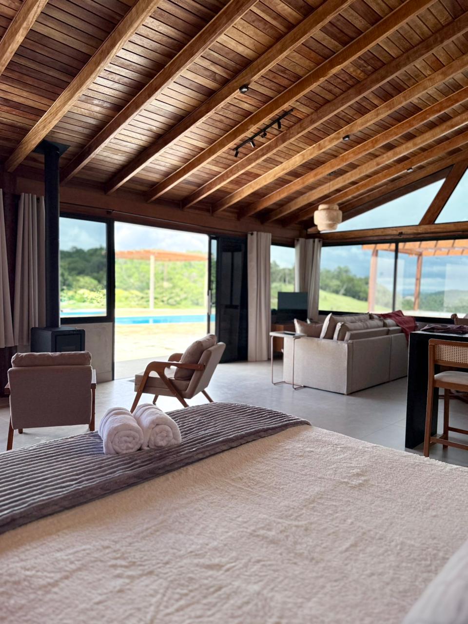 Cabana Gourmet de 42 m² à beira da represa, com hidromassagem privativa, cama queen, Smart TV, WiFi, ar-condicionado quente/frio, cozinha completa e varanda com linda vista. A piscina climatizada, fogueira, churrasqueira e os 27.000 m² de áreas externas são compartilhados entre duas cabanas. Informações importantes: -Acesso por estrada asfaltada e Uber -Refeições não estão inclusas -Não fazemos day use -Não há check-in antecipado -Check-out após 15h somente se não houver hóspedes chegando