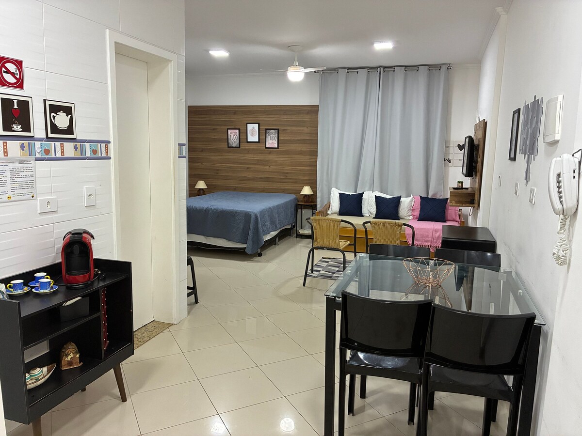 Newly renovated Studio/Kitnet. Cozy, comfortable and clean decoration. In the heart of Pitangueiras Beach, located one block from the beach with a side view of the sea. In the center of Guarujá's most famous beach. 📍Close to shops, restaurants, markets, pharmacies, wineries, bakeries, ice cream parlors, laundries. Here you won't need a car for anything. It is possible to do everything on foot.