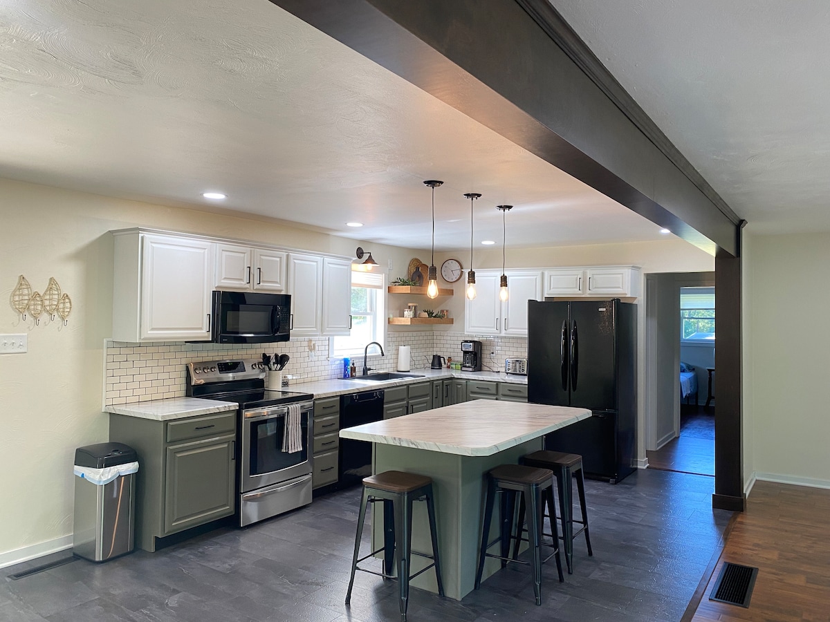 Enjoy a family vacation, reunion or weekend getaway at this spacious and quiet place! Greenfield Manor is located at the end of a dead end street just outside of town. Can comfortably sleep up to 12 adults but there is plenty of space to set up air mattresses etc. in the basement. There is lots of outdoor yard space, back porch, and a peaceful patio area with a fire ring. Feel free to message me with any questions if your group is larger than 12 and I will see what I can do to accommodate you!