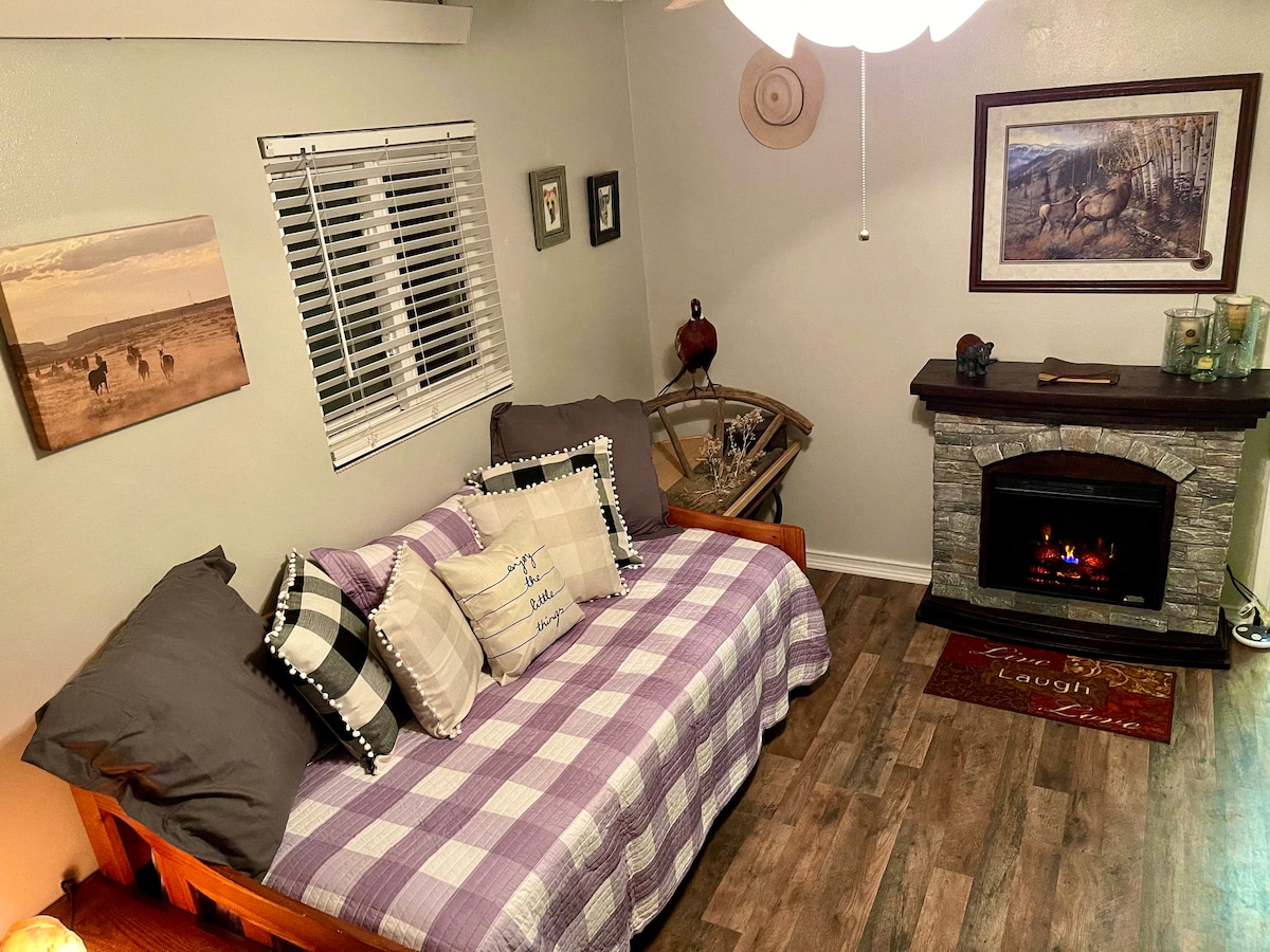 This very charming upstairs apartment over a gift shop has two bedrooms and a full kitchen for guests to enjoy preparing meals. The balcony is a perfect place to sit and enjoy a cup of coffee and take in the small town atmosphere! The decor is fun as one bedroom is very light and the other is based on Wyoming! Great businesses all within walking distance! You will love the small town downtown experience! This apartment does have a flight of stairs to get to it. We offer discounts on longer stays