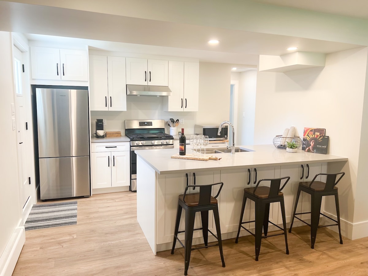 "Wow. Stop your search! Stylish, comfy, and great location." Licence 00177004 Your modern hideaway is a thoughtfully designed and newly built luxury suite. Open-concept and bright, it offers a welcoming fireplace, spa-like bathroom with soaker tub and rainfall shower head, and a fully-equipped chef's kitchen. Family neighbourhood, 1/2 block walk from local park & nature trails Amenities include: -50" Smart TV w/Crave, Netflix, & CBC Gem -Highspeed Fiber Internet -Fantastic library