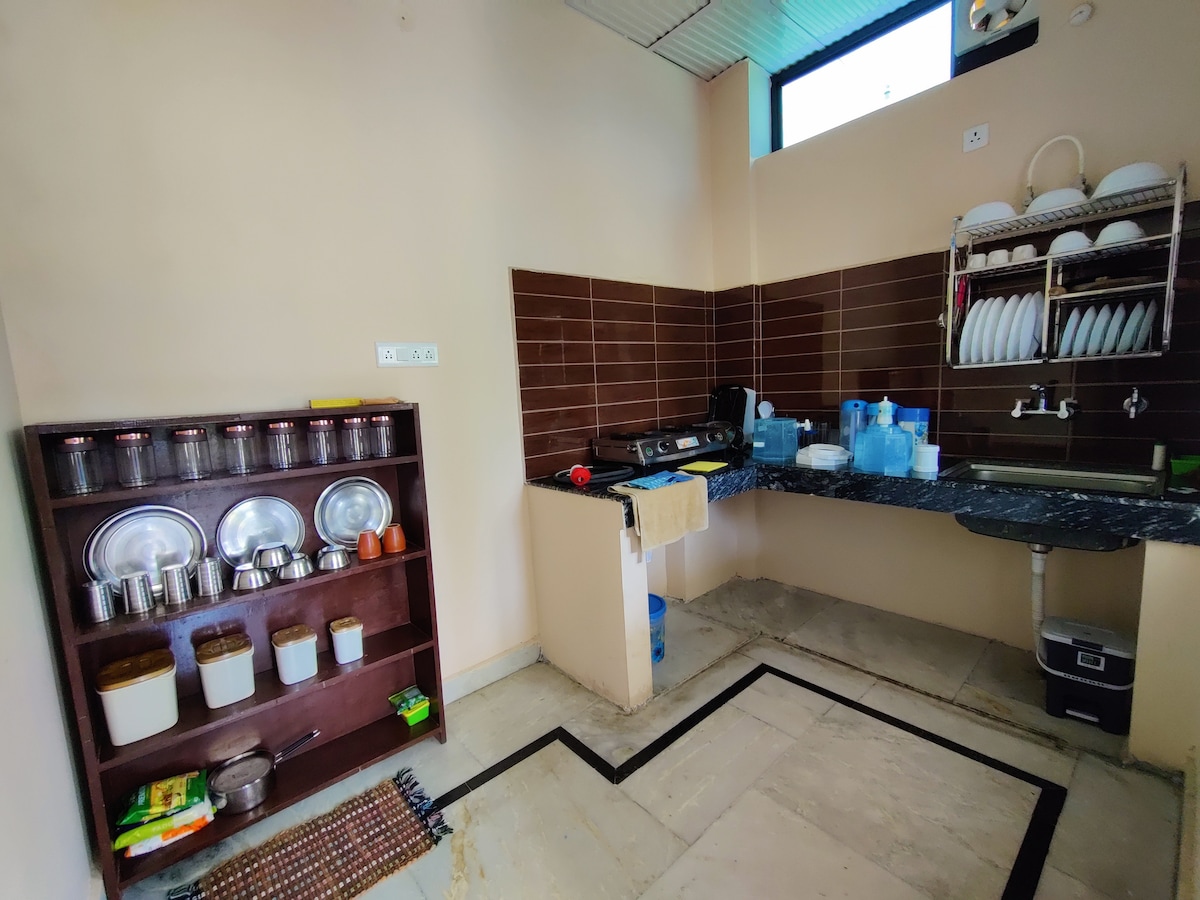 Perfect long term gateway or WFH station for family & group of friends A serene stay overlooking the rice farms with stunning mountain views, conveniently located away from the tourist hustle & yet close to the flying city Bir(2Km). The bathroom(not attached) is a mix of village style feel with modern amenities, has a shower, geyser & western style seat in a separate cubicle. Kitchen is fully functional with fresh supply of vegetables from garden along with basic ingredients supply.