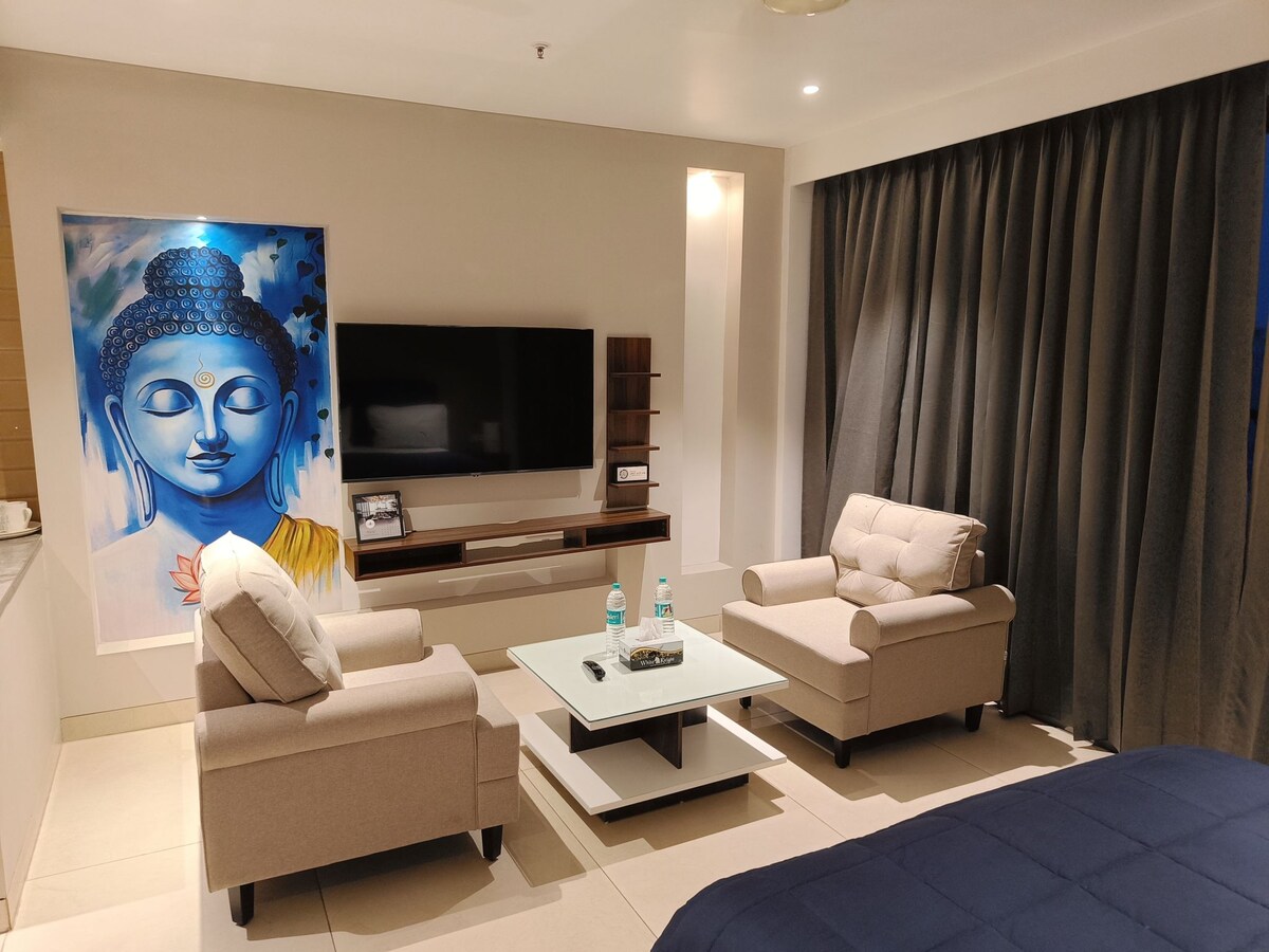 It’s a service studio apartment, most suitable for couples, long stays and solo & international travelers. Relax in style at this spacious place with beautiful view from your private balcony. One gets complete privacy suitable for long and short stays. Being next to shopping mall everything is at hands distance including *Clubs, diners, kids area, salon, movie hall and shops. *Inside the building access to Gym, pool table and sauna bath *24/7 security makes it very safe for solo female guests.