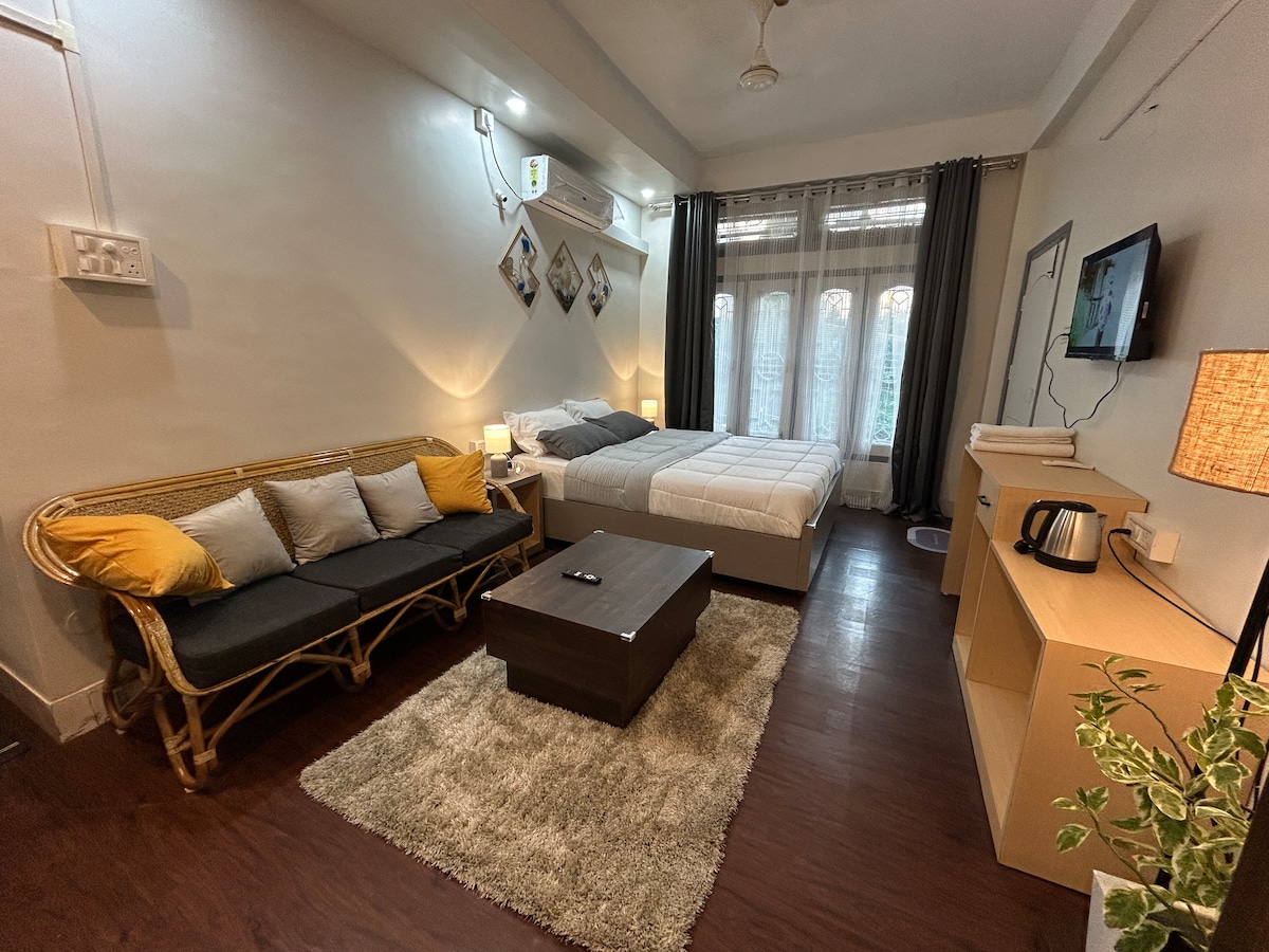 It is an urban apartment with an attached bathroom and kitchen, providing all the amenities in a home along with a work station and a garden facing balcony. Bright, spacious and airy atmosphere provides a refreshing environment to relax and enjoy a peaceful time. The space is centrally located and surrounded by major hospitals, malls, offices/coaching centres & eateries/recreational spots.