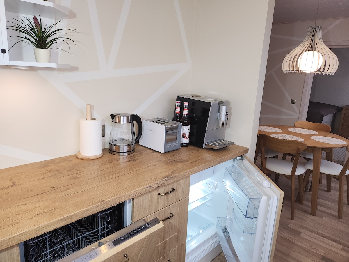In this quiet and very well located place you can live a simple life. The apartment is not intended as a party venue. There is a kitchen with everything you need (oven, stove, fridge, kettle, coffee machine), bathroom (shower and washing machine), living room with two sofas (2 and 1 person; there is also an extra bed). The apartment has a balcony with a cozy seating area.