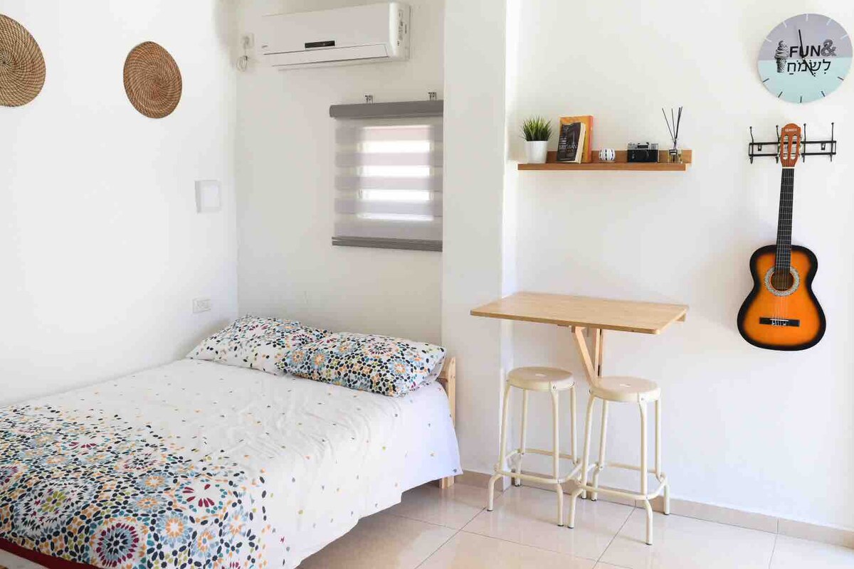 A comfortable renovated sunny studio with queen-size bed, a/c, private WC, shower, fully-equipped kitchen, roof garden, free parking, a communal shelter on the ground floor, fast Wi-Fi, free breakfast upon request. Prime location. Walk distance to Beit Protea, IDC, bus station! 7 min by car to the beach. Full bedding+towels, constant hot water and drinking water supply, hairdryer, espresso machine, yoga mat. If You miss your beloved pet - our dog Donna at your service ๐Ÿ˜€. Speaks EN, HE, RU.