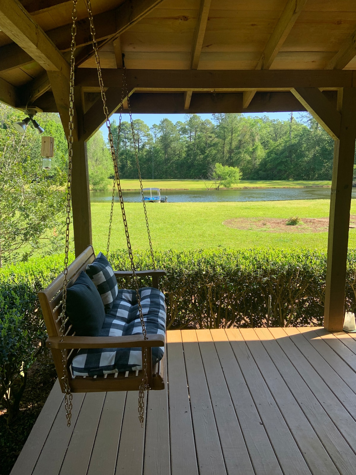 Enjoy a comfortable retreat in a historic 1930s cabin overlooking a 350-acre private lake. This fully renovated farmhouse features its original beadboard. The historic touches, combined with all the modern amenities, make this the perfect destination for those seeking to enjoy a getaway into nature and fishing experience. The lake is loaded with largemouth bass, catfish, speckled perch, bream, and bluegill and is only otherwise available by very limited membership. See more on IG @lake_nichols
