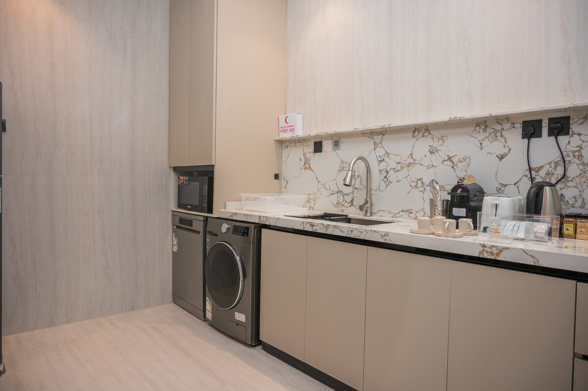 Featuring a unique design that ensures comfort and luxury, with hotel furniture, it includes a master bedroom with a private bathroom The location is Al-Fajr neighborhood, where the airport is 10 minutes away, the train station (Sar) is 15 minutes away, the center of Hail is 10 minutes away, and the view of Hatem Al-Tai is 15 minutes away. Near it is the village of Akda and the Aja mountain range, the place of respite for the people of Hail and its visitors, and near it is Mohammed Al-Arifi Street and Prince Saud bin Abdul Mohsen Street because of its modern restaurants and cafes, and next to it is Sababa Park, Al-Adham Café, Jisha Café, Ghamra Café and others