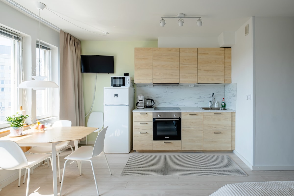 Stylish new fresh studio with city and sea views. Large balcony to south. Windows from floor to ceiling to east and south. Youthful, trendy Kalasatama/Sompasaari area in Helsinki. The apartment is just a 5-minute walk from the sandy beaches, nature, and sports terrain of Mustikkamaa. Next to Redi Shopping Centre, Korkeasaari Zoo and Teurastamo Restaurant and Event Hub. Bus and tram stops are 20 meters away, and the nearest metro station is Kalasatama.