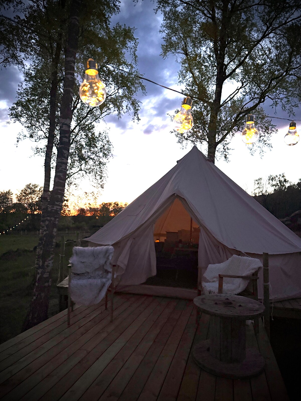 Experience glamping in scenic Halland! Stay in the middle of our alpaca meadow with curious alpacas grazing just outside the tent. Here you will live comfortably in a spacious tent with a double bed, your own composting toilet and the possibility to cook over an open fire. A unique and relaxing nature experience – perfect for those who want to live close to animals, nature and tranquility. The booking includes Björnblad's Glamping Breakfast with fresh bread and eggs from our chickens on the farm.