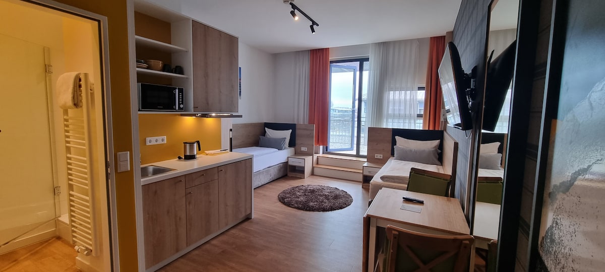 Modern business apartment in Hallbergmoos near Munich airport. Quietly located and functionally equipped with bright layout, fully equipped kitchen as well as dining and working area. The property is located in a quiet business building and is primarily aimed at business travelers and short-term guests. Families are welcome, but should note that the apartment is more designed for quiet, short stays. Contactless check-in.