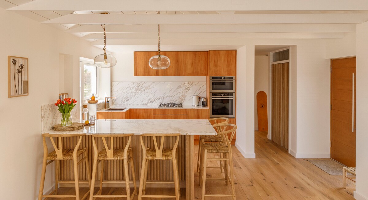 With a nod to the ease, optimism and aesthetic of mid-century California, Casa Paloma is a 3 bedroom vacation bungalow in Braunton, North Devon. Beneath a mono-pitch roof that evokes Palm Springs style, a vaulted ceiling in the open-plan kitchen, diner and den creates an airy spot for living and lounging. The south-facing garden frames the view of sand dunes in the distance, while outdoor decking, seating and cooking facilities extend the oceanside vibe. Saunton Beach is a 5 minute drive away.