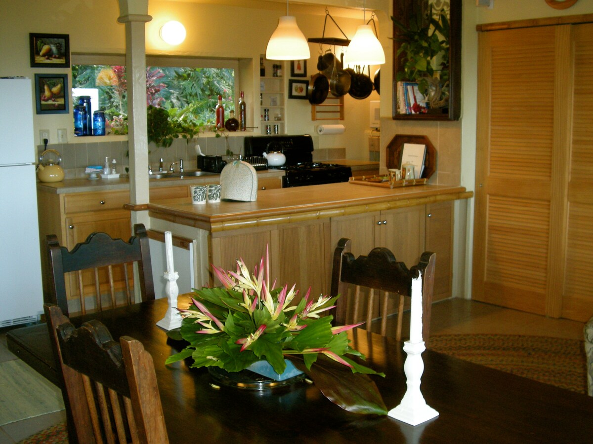 Located 10 minutes from Hana town & across the road to Waioka Pond. The elevated cottage captures the breeze passing through aromatic trees; various bird songs, with gentle air flowing through screen doors on all sides of the cottage A screened breakfast nook connected to the kitchen. Ceiling fans add additional air flow to comfort on the warmest days and nights. Kitchen amenities include countertop appliances, electric range stove, full size refrigerator & an electric grill. Smart TV / Wifi.