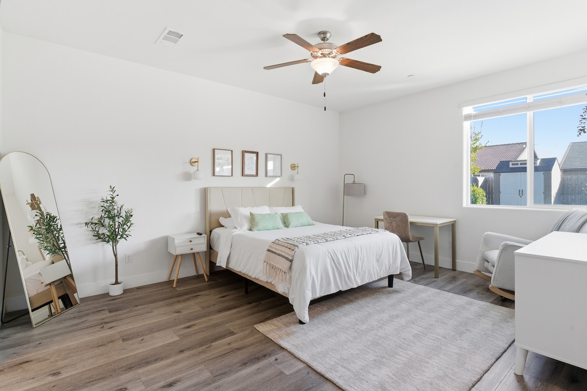 Relax in this beautiful, newer home located in a SAFE and QUIET NW Visalia neighborhood. Ideal for vacations, work trips, or a restful stopover. This peaceful retreat features 3 bedrooms and 2 baths. Enjoy a spacious primary suite with a king bed, walk-in closet, soaking tub, and walk-in shower. Close to Sequoia & Kings Canyon, with fast Wi-Fi, easy parking, and a smoke-free environment.