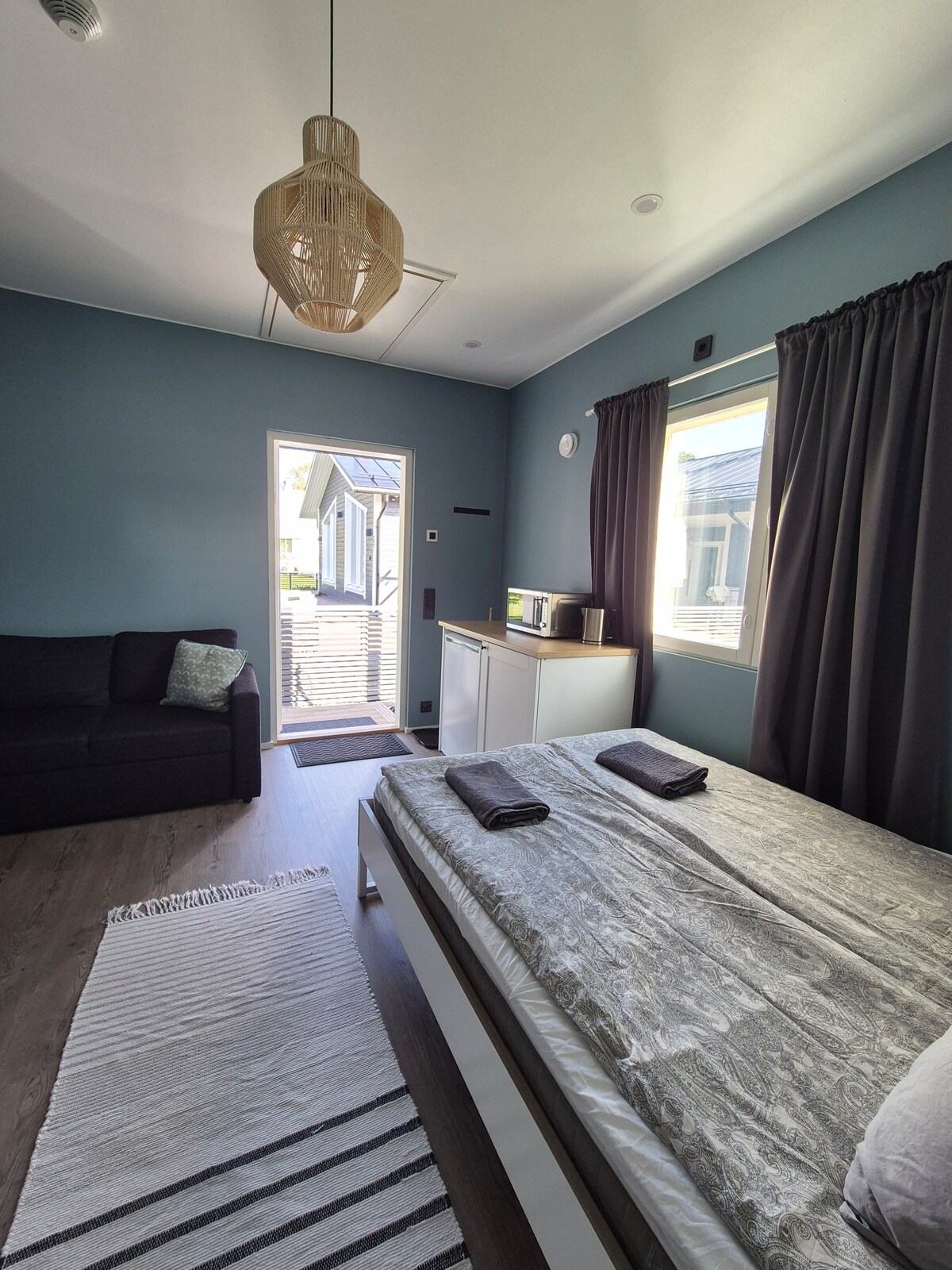 The spacious 36m2 studio is ideal for a shorter or longer holiday as well as telecommuting. Located in a quiet apartment building, the apartment includes a spacious, fully equipped and newly renovated kitchen, a large room, an alcove and a bathroom/toilet. The apartment also has a glazed balcony. Shops and train station are a few hundred meters away, and Hanko's famous Plagen beach is 1.5 km away, which you can cycle to in 5 minutes.