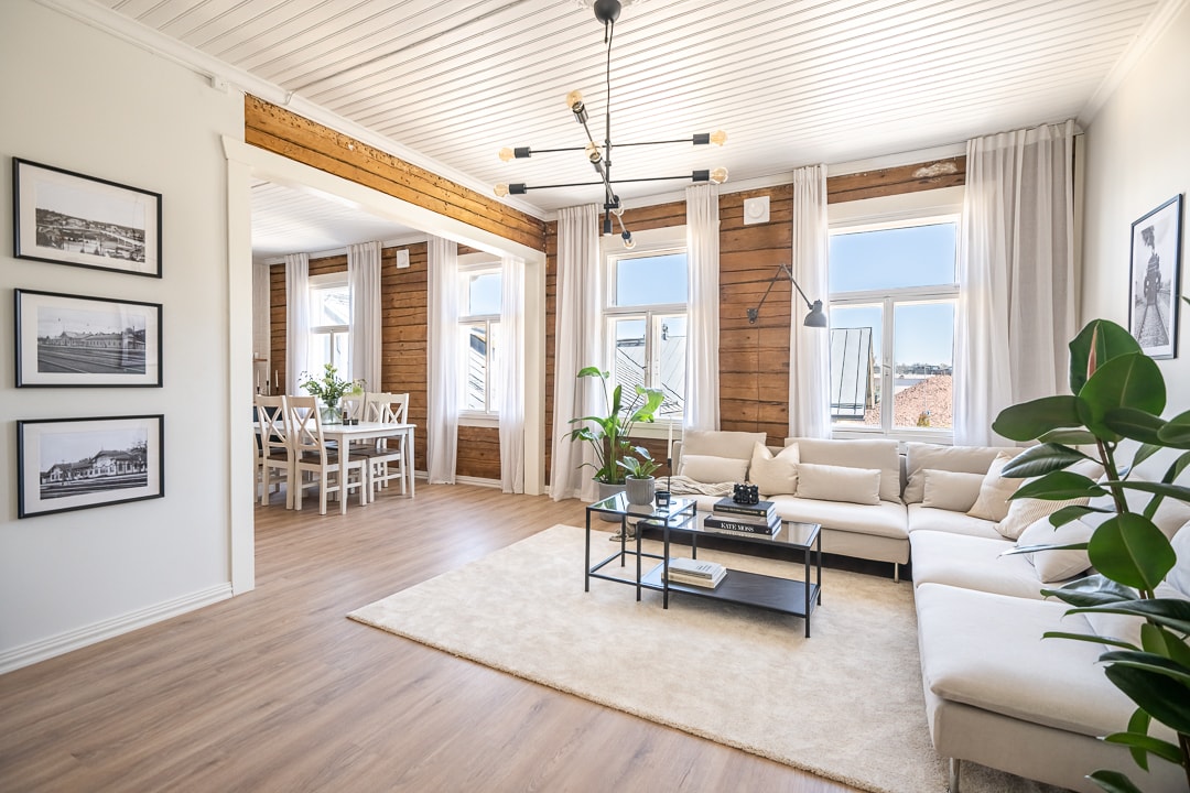 A historical, yet completely modernised villa. Located in the historic centre of Hanko (Finland), a premier destination for Finnish coastal beauty, culture and heritage. Modern and thoughtful amenities throughout, ranging from a SAUNA, AIR CONDITIONING (heat + cool), JACUZZI all the way to eco-friendly SOLAR PANELS providing most our of electricity. Featuring recently refurnished living area complete with new sofa, designer chairs, design fixtures and art.