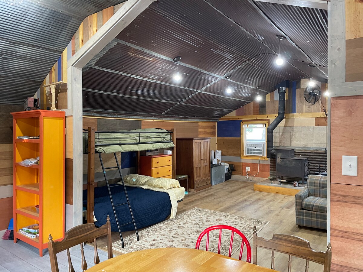 Welcome to a backyard getaway that will drop your mouth in awe. Kinda like "GLAMPING" but better!Has heat and Air .Unique, corky but a great place to relax and put your feet up in the hammocks inside. Must be able to climb a 6 foot ladder to get to loft to sleep. Can come to the main house to go to the bathroom or use the best compost toilet ever attached to your getaways space. Kitchen area if needed in wine area to use. Firepit and grill to use for cooking also. A place like no other!
