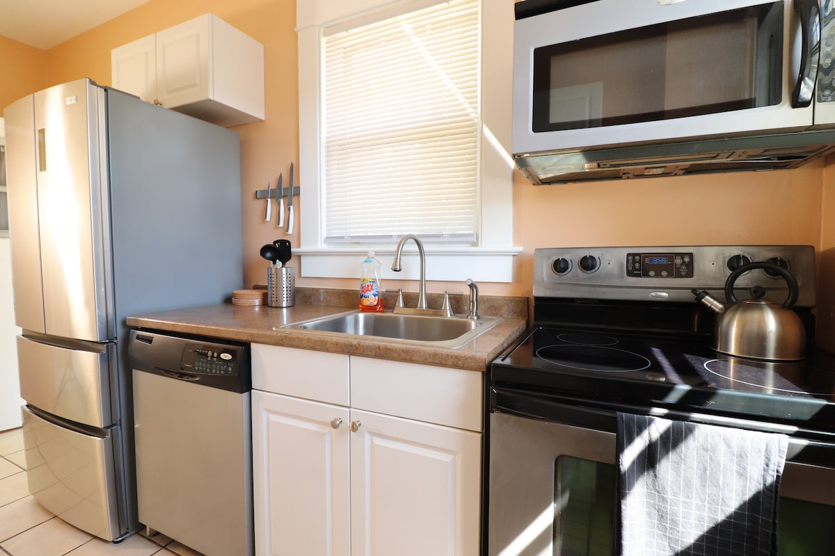 Stylish backhouse retreat with premium finishes. Spacious bedroom with king bed and smart TV, plus living area with its own TV. Fully-stocked kitchen with essentials, cookware, coffee maker and air fryer. Bathroom has dual entrances for privacy. Amenities include in-unit laundry, 6-person dining table for gatherings or remote work, and garage parking. Pantry comes with basics so you can settle in right away. Your serene downtown escape with complete privacy!