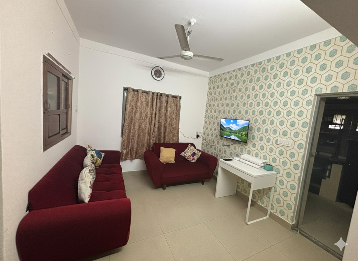 Aura is a brand‑new modern 1BHK located in a calm, secure building at Akshayanagar Circle. The home includes a cozy living room with a 43‑inch Google TV, a fully equipped kitchen, inverter power backup, a washing machine and a peaceful bedroom with a queen bed. Designed for two, families, solo guests and couples, Aura offers everything you need for comfort and convenience. Supermarkets, cafés, transport, food street and essentials are just steps away.