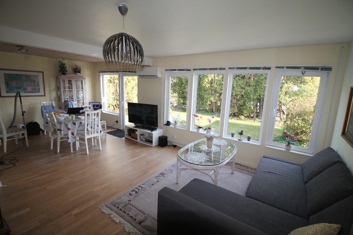 "Garden villa" with large terrace with sea view in a south-facing location. Built in 2019. Located in a residential area near the sea and nature, 6 km from Halmstad city center. 500 meters to the swimming area and marina. Bus stop about 100 meters. Grocery store 400 meters. Hiking trail 15 km along the sea. About 3 km to Tylösand, Sweden's famous sandy beach. No smokers or pets "Garden villa" with sea view from the large patio facing south. Built 2019. Residential area, 500 meters to the sea, bus stop 100 meters, supermarket 400 meters. No smoking, no pets.