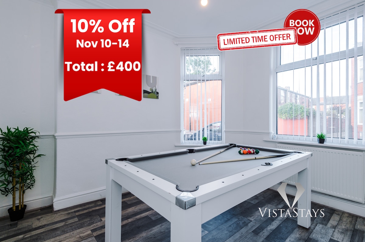 Welcome to our stylish and spacious 2-bedroom family home in Manchester! Ideal for families, friends, or business travellers, this modern retreat offers ample space for up to 6 guests, with all the amenities for a comfortable stay. ✔️ Large Secure Driveway ✔️ Sleeps 6, King Bed ✔️ Pool/Ping Pong Table ✔️ Smart TV ✔️ 10 Min to City Centre ✔️ Open-Plan Dining & Living ✔️ Family-Friendly w/ Private Garden ✔️ Superfast Fibre WiFi ✔️ Welcome Pack & Complimentary Amenities ✔️ Stringent Deep Cleaning