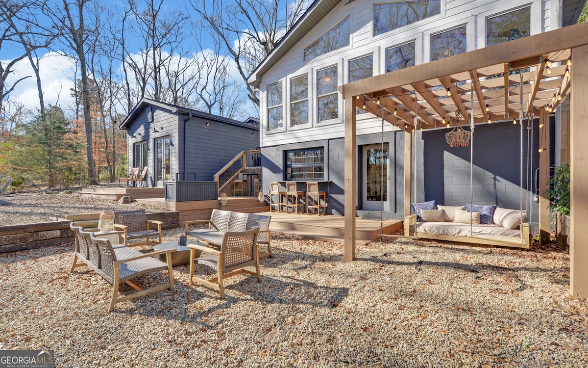 Featured in AJC as one of Georgia's top Airbnb's! We designed our lakefront A-frame cabin to provide the perfect getaway, and we love sharing our home with you. Wake up to sunrises over the lake while you sip coffee on the large deck or drink hot cocoa by the fire pit. Our modern kitchen also begs to be cooked in. In warmer months, enjoy swimming, kayaking, or paddle boarding off the private dock. Whether you want to relax or work on spreadsheets, you'll enjoy a beautiful view while doing so.