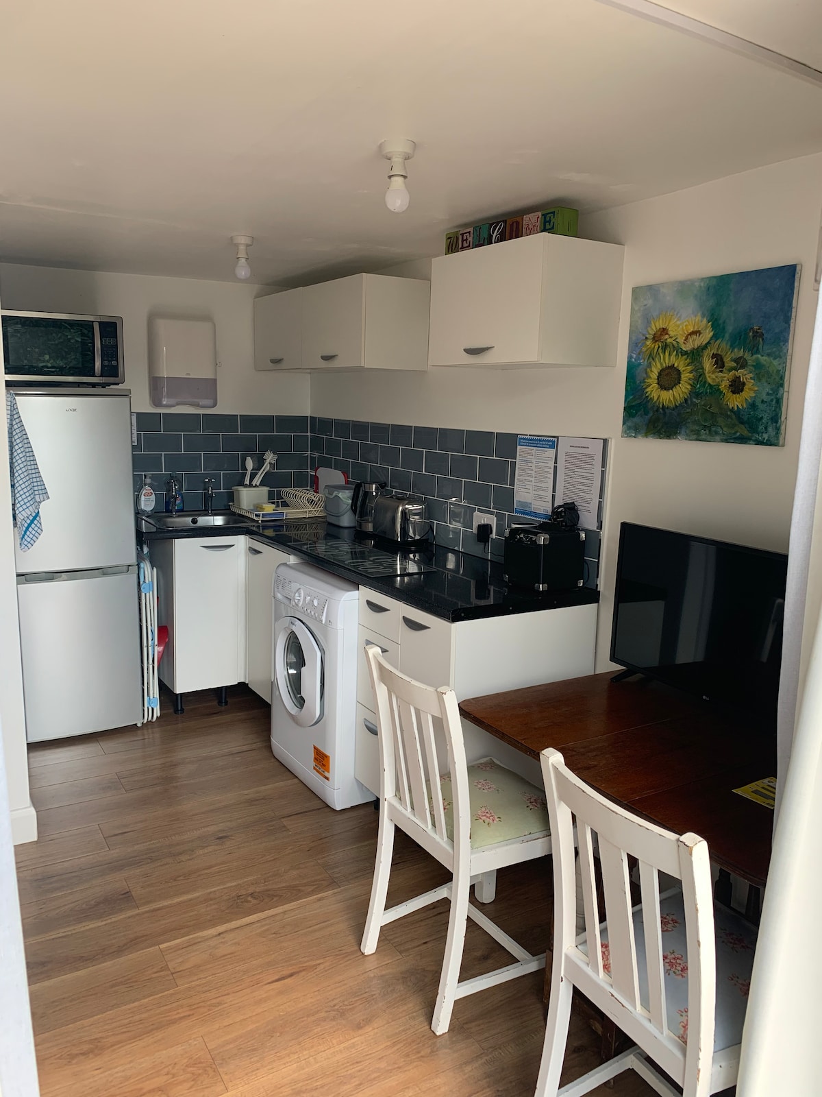 Detached chalet luxuriously appointed with smart TV with Netflix .silent ,good sized fridge, kettle ,toaster microwave,iron and board) comfortable king size bed with large bedside tables with plenty of clothes storage, and hanging space.there is a small table with chairs stored under the bed,so can be used for meals or a work space.we have a newly refurbished bathroom,with massive walk in shower..there is outdoor table and chairs to enjoy the afternoon sunshine.