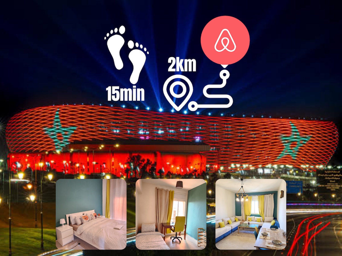 This 2 bedroom apartment in Prestigia Hay Riad is perfect for a comfortable stay. Located at a 2-minute walk from restaurants, supermarkets, and bakeries, it offers access to gardens, swimming pools, and a free private parking. The apartment is stadium front , just a short 10min walk to the stadium to watch your favorite CAN football games.