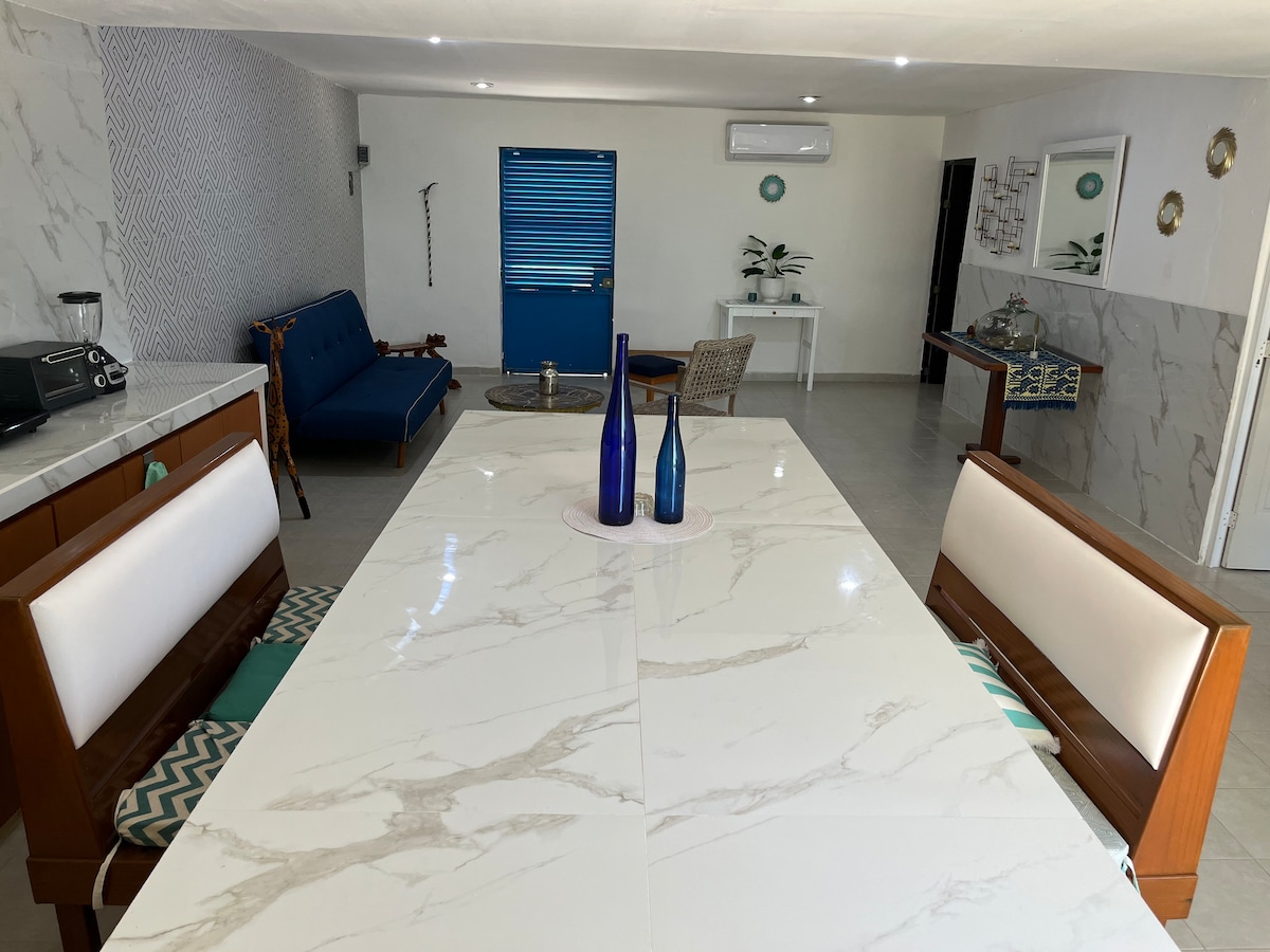It's a complete accommodation with a private pool. Property located a few steps from the famous Calle 59, full of cafes, restaurants and bars. The decor is colonial, the living room with sofa, 50"TV with Netflix, Wi-Fi, dining room for 6 people, kitchen with magnetic induction stove, refrigerator, microwave oven, 1 bedroom with king size bed, 32"TV, 1 air conditioning, wardrobe, bathroom with hot water and terrace with pool. Air conditioning is only in the room.