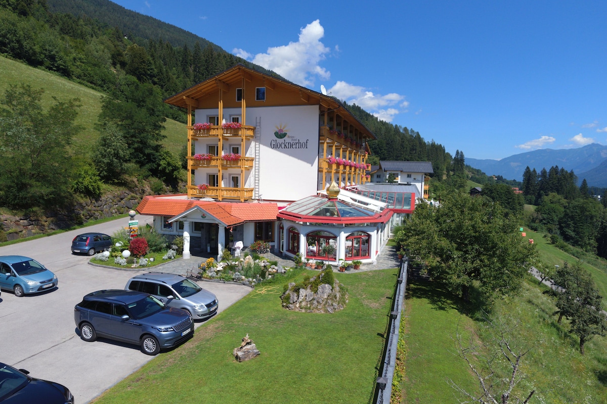 New double room comfort in the guest house of the Glocknerhof. The price includes the breakfast buffet as well as the use of hotel facilities such as wellness, swimming pools, common rooms and sports and family offers as well as participation in the weekly program.